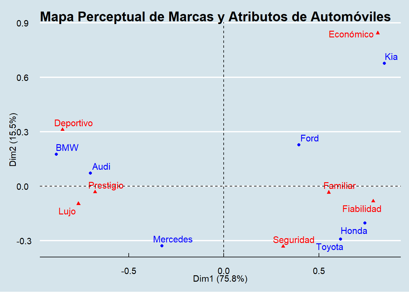 Interpretación de la Proximidad (Puntos del Mismo Conjunto): La distancia entre dos puntos de fila (o dos puntos de columna) es una medida de su similitud. Si dos marcas de coche están muy cerca en el mapa, significa que tienen perfiles de atributos muy parecidos; son percibidas de forma similar por los encuestados. Si dos atributos están cerca, significa que tienden a ser aplicados a las mismas marcas.