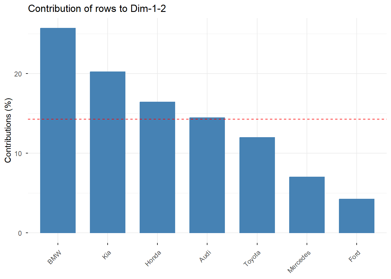 Perfiles de Fila y Perfiles de Columna: Imaginemos una tabla que cruza “Marcas de Coche” (filas) con “Atributos” (columnas). El perfil de una fila (por ejemplo, de la marca “Volvo”) es simplemente la distribución de sus frecuencias a lo largo de las columnas. Nos diría qué porcentaje de las menciones de Volvo se asocian con “Seguridad”, qué porcentaje con “Diseño”, etc. De forma análoga, el perfil de una columna (por ejemplo, del atributo “Deportivo”) nos diría qué porcentaje de las menciones de “Deportivo” corresponden a “Ferrari”, qué porcentaje a “Porsche”, etc. El ACS funciona, fundamentalmente, comparando la similitud de estos perfiles. Dos marcas con perfiles de atributos muy similares serán consideradas cercanas, y por tanto, se representarán próximas en el mapa final (Abdi and Valentin 2007a).