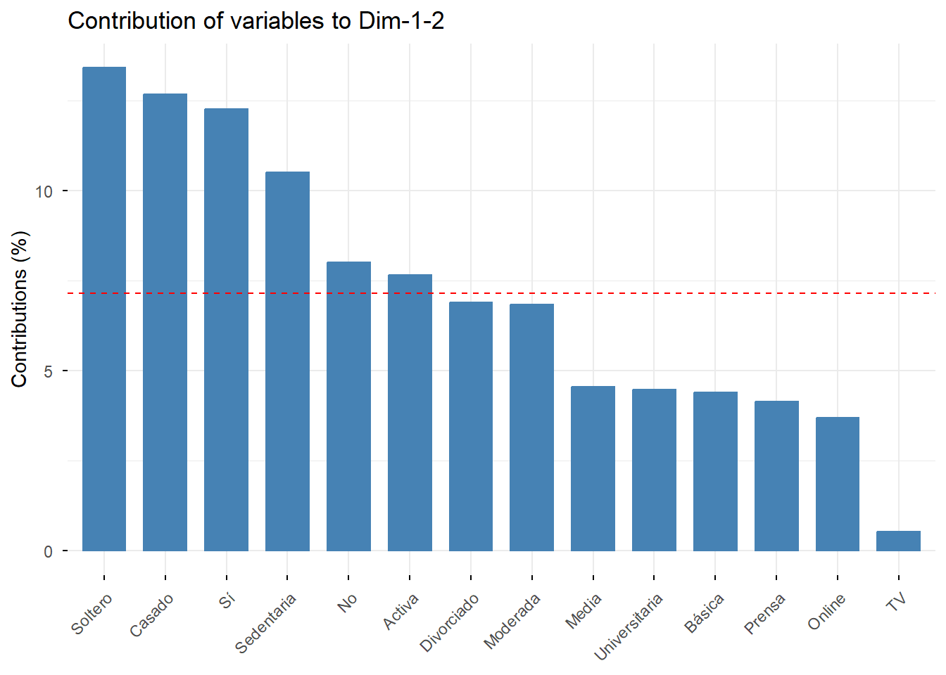 El gráfico nos muestra que las variables que más contribuyen a la construcción de las dos primeras dimensiones son Preferencia.Noticias y Actividad.Fisica, seguidas de Nivel.Educativo. Esto valida que nuestra interpretación de los ejes, basada en estas variables, era correcta.