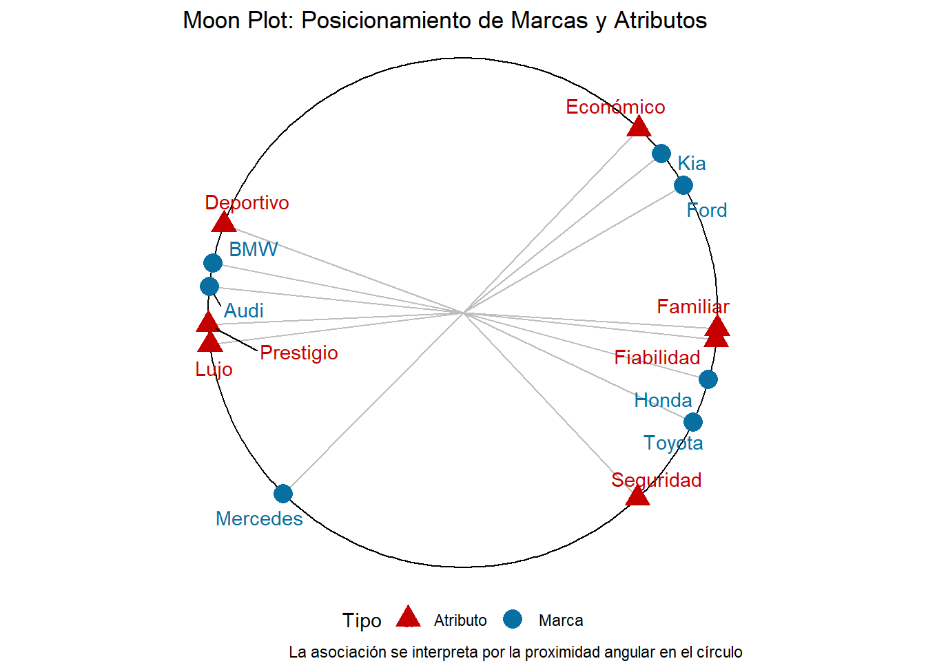 Al normalizar la posición de todos los puntos para que estén a la misma distancia del centro, el moon plot nos obliga a centrarnos exclusivamente en las direcciones. De esta manera: * Una fuerte asociación entre una marca y un atributo se visualiza inequívocamente como dos puntos que están muy juntos en el borde del círculo (un ángulo pequeño entre ellos). * Una asociación nula se representa por puntos separados por 90 grados en el círculo. * Una “repulsión” o asociación negativa se representa por puntos en lados opuestos del círculo (180 grados).