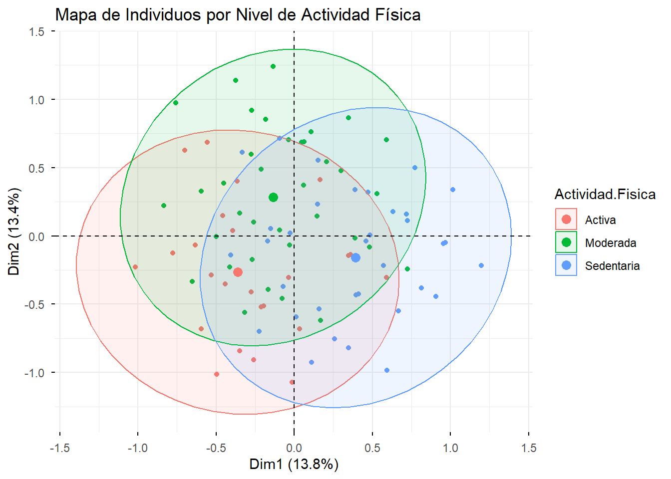 Interpretación del Mapa de Individuos: ¡La estructura es ahora evidente! El mapa revela una clara segmentación. * La elipse roja, que agrupa a los individuos con actividad “Sedentaria”, se sitúa en la parte derecha del mapa, justo en la zona donde habíamos localizado las categorías “TV”, “Casado” y “Básica”. * La elipse verde, de los individuos con actividad “Activa”, se encuentra en la parte izquierda, en la zona de las categorías “Online”, “Universitaria” y “Soltero”. * La elipse azul (“Moderada”) ocupa una posición intermedia.