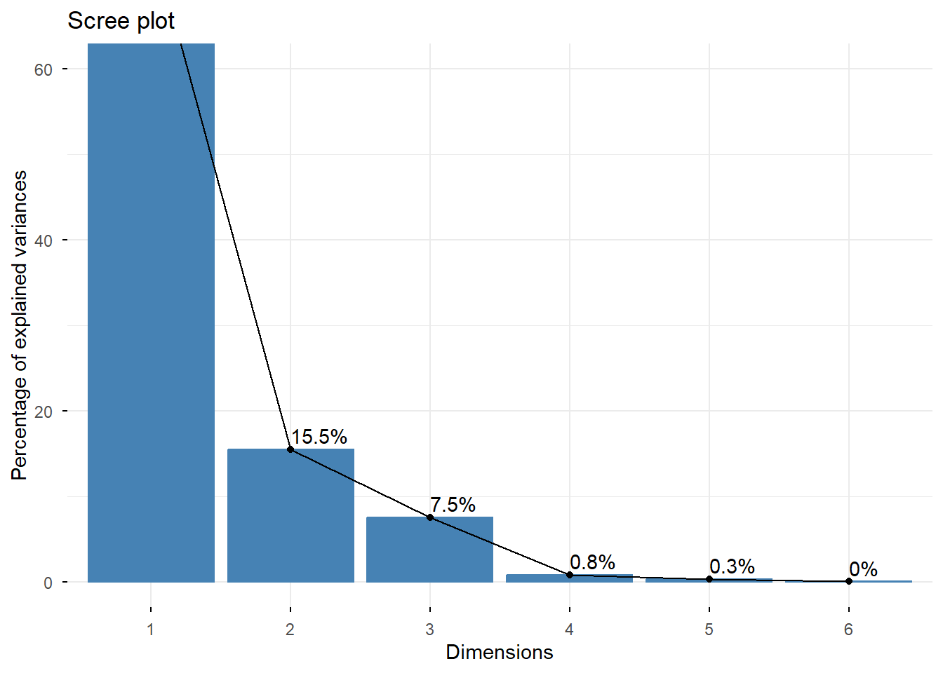 El gráfico muestra una clara “caída del codo” después de la segunda dimensión. Las dos primeras dimensiones capturan casi el 60% de la inercia total, una cantidad muy considerable para un ACM. Por tanto, un mapa 2D será una excelente representación de la estructura principal de nuestros datos.