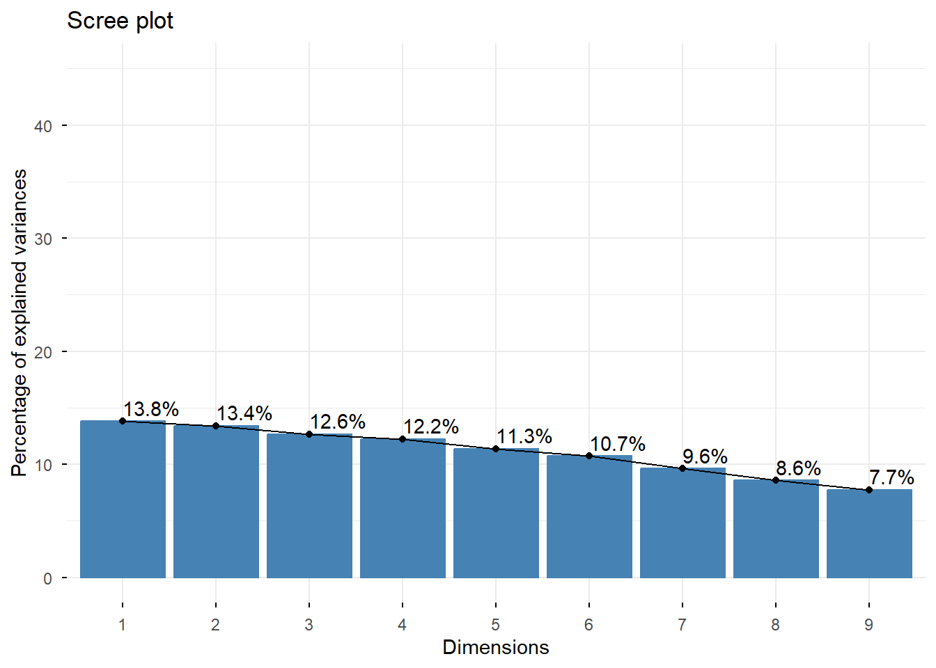 fviz_eig(res.mca, addlabels = TRUE, ylim = c(0, 45))Warning in geom_bar(stat = "identity", fill = barfill, color = barcolor, :