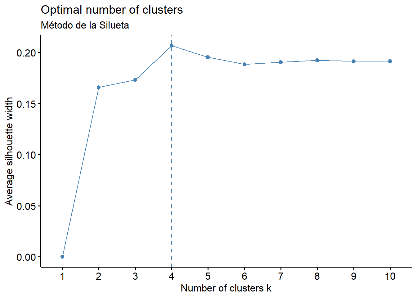 Interpretación: * Método de la Silueta: Sugiere un número óptimo de 4 clústeres, ya que es el punto donde el ancho promedio de la silueta es máximo. Un valor alto indica que los objetos están bien clasificados en su propio clúster y mal en los clústeres vecinos. * Método del Codo: Muestra un claro “codo” en 4 clústeres. A partir de este punto, añadir más clústeres ya no proporciona una reducción significativa en la suma de cuadrados interna (la varianza dentro de los clústeres).