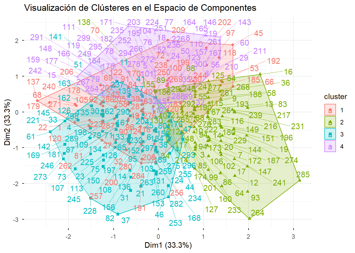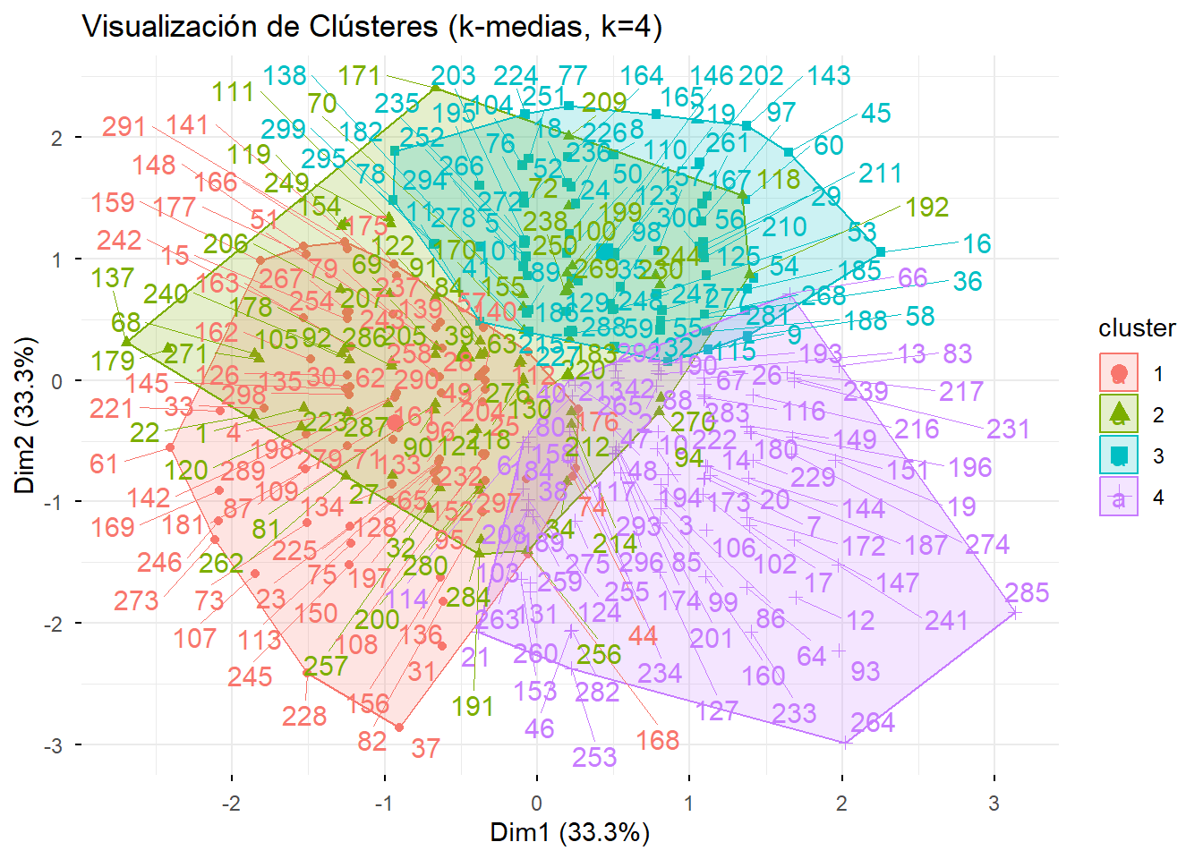 Interpretación: El gráfico muestra cuatro segmentos muy bien definidos y compactos. Visualmente, la solución es muy similar a la obtenida con el método jerárquico, pero los grupos parecen aún más cohesivos, lo cual es esperable, ya que k-medias está diseñado específicamente para optimizar esta compacidad.